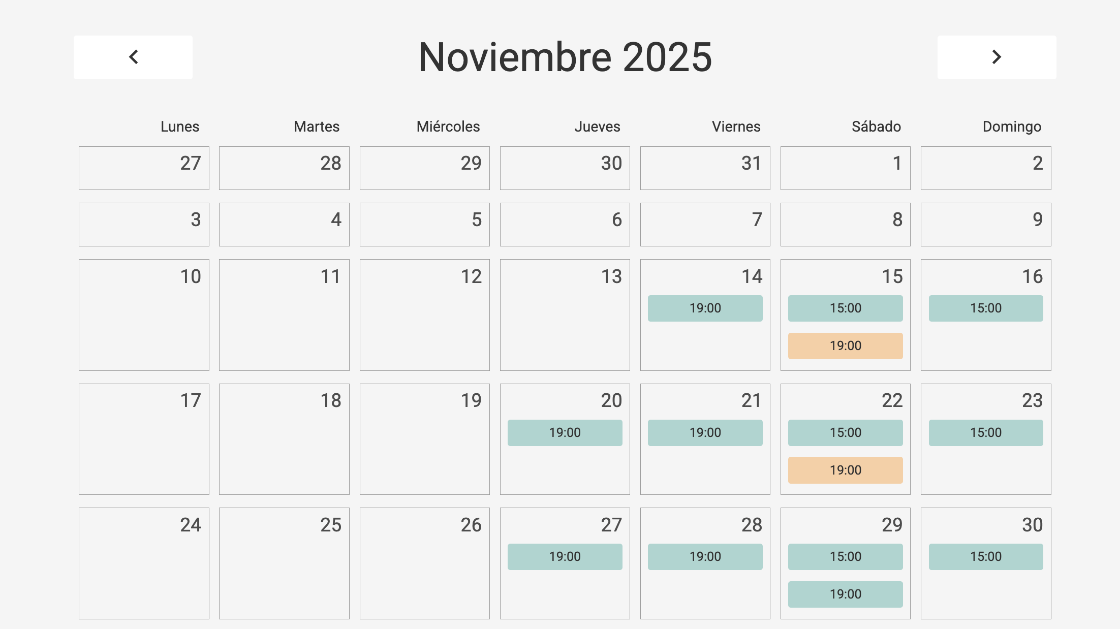 1. Cuando estas en el calendario deberás de seleccionar una de las sesiones de jueves, viernes, sábado a las 15:00 o domingo.
