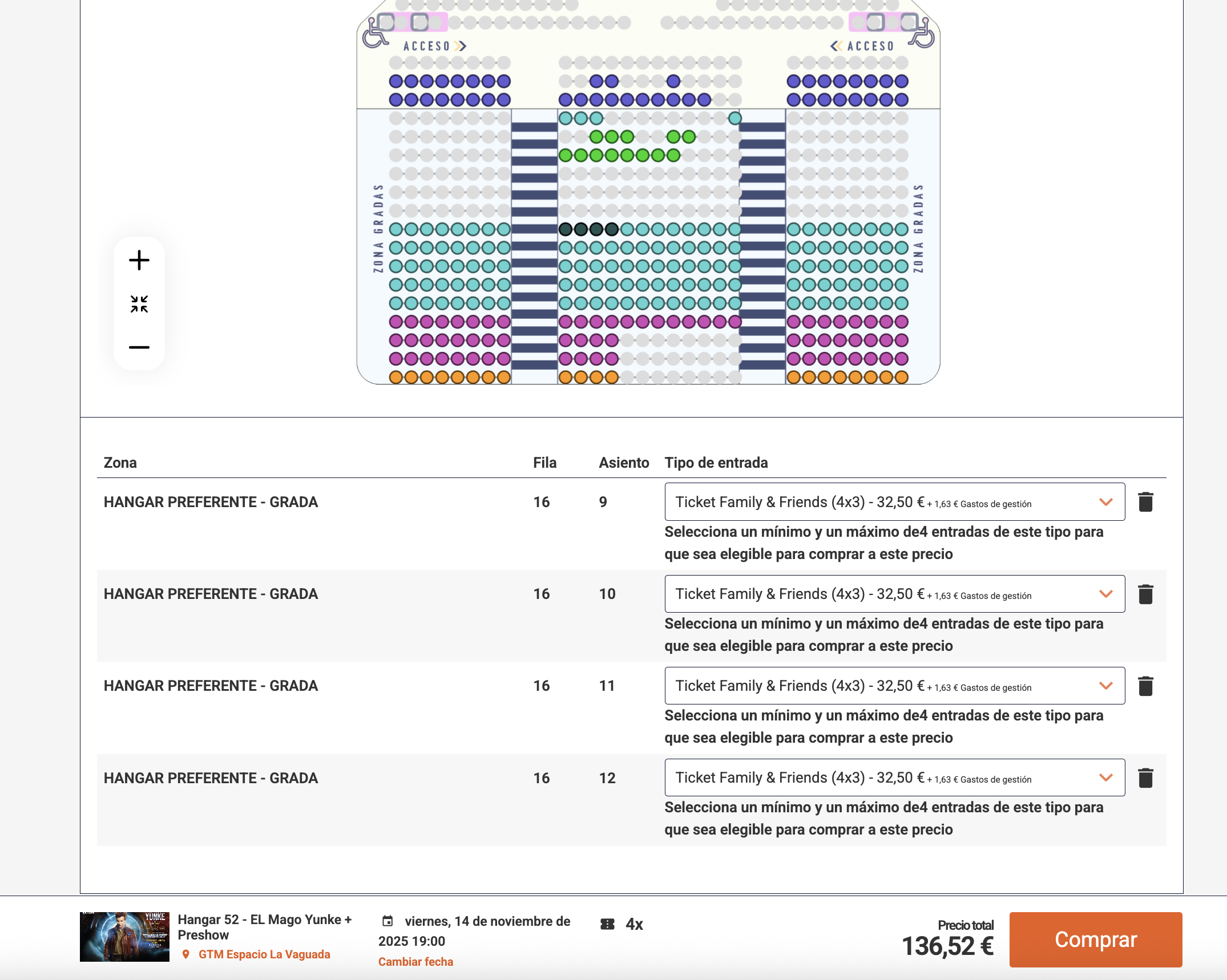 2. Después selecciona las butacas y en la parte inferior cambia el precio de las 4 u 8 butacas. Si por ejemplo comprases 5 butacas, la quinta butaca deberá de tener precio general. Te ocurrirá lo mismo si compras 9 butacas, la novena deberá de tener el precio general. En la siguiente imagen verás como deberás de quedar las 4 entradas después de seleccionar el precio.
